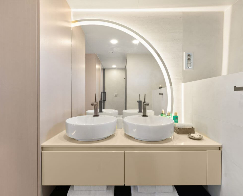 16 m2 cabin with a double bed (180×200 cm). Private bathroom with shower box and home type toilet. Convertible into Twin cabins with 2 single beds (90×200 cm).